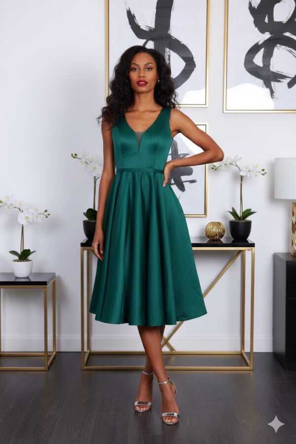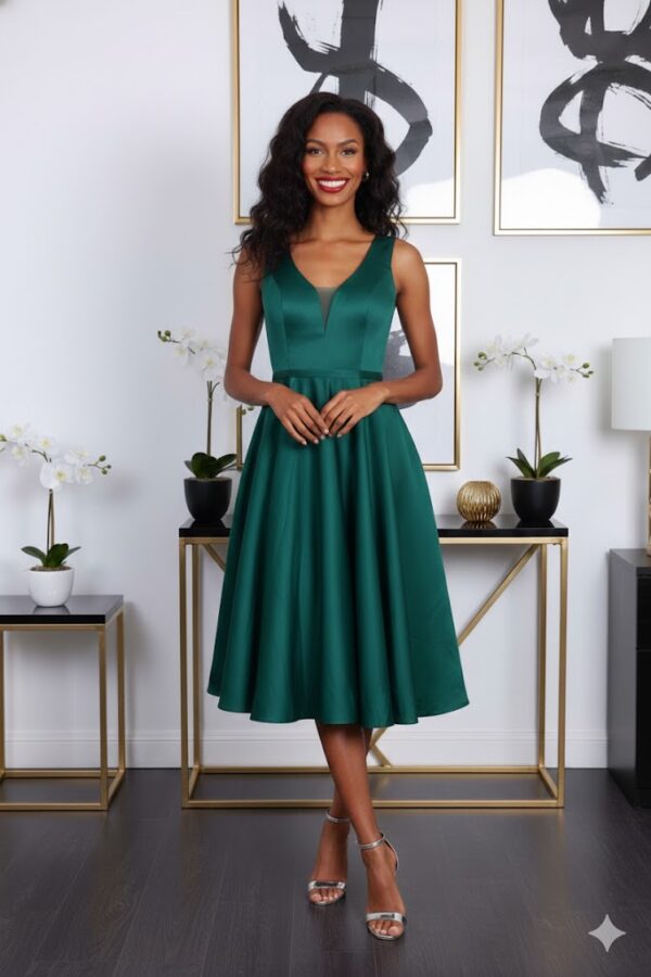 Az ujjatlan fazon és a dekoltált felsőrész elegáns, mégis nőies összhatást teremt, így a ruha ideális választás esküvőkre, vacsorákra, ünnepi eseményekre vagy bármilyen alkalomra, ahol stílusosan szeretnél megjelenni. A nem elasztikus anyag szépen tartja a formát, a hátul elhelyezett cipzár pedig megkönnyíti az öltözködést.