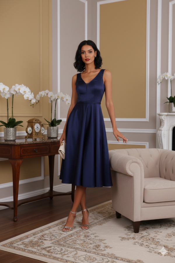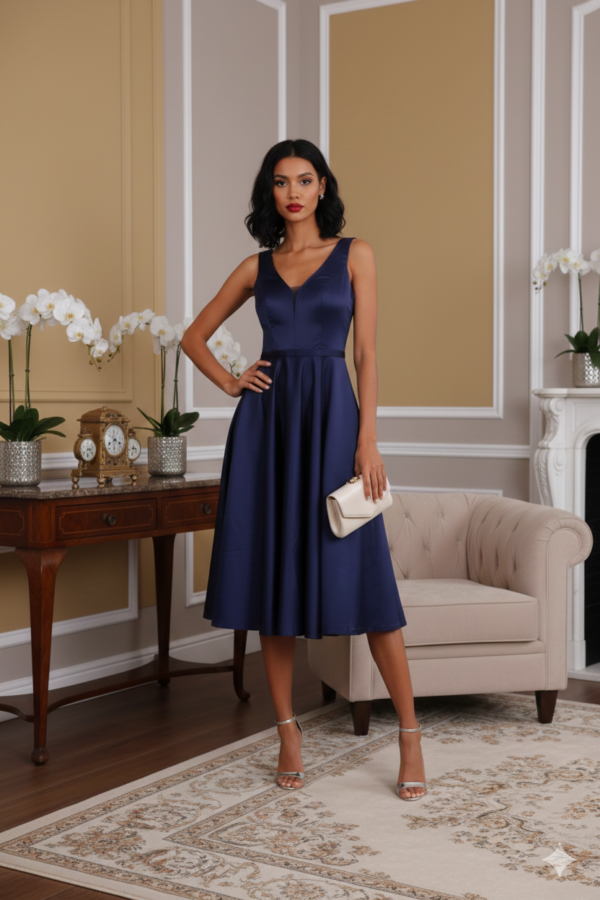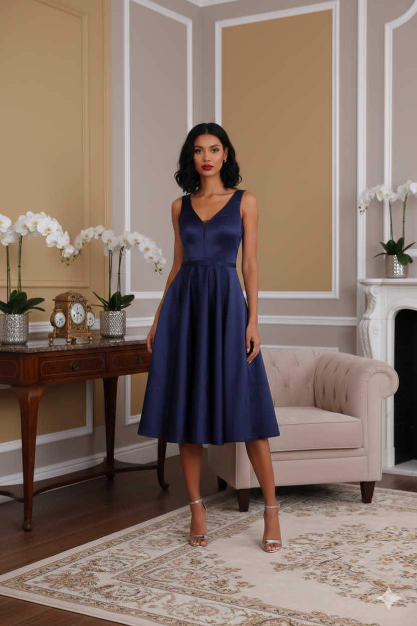 Az ujjatlan fazon és a dekoltált felsőrész elegáns, mégis nőies összhatást teremt, így a ruha ideális választás esküvőkre, vacsorákra, ünnepi eseményekre vagy bármilyen alkalomra, ahol stílusosan szeretnél megjelenni. A nem elasztikus anyag szépen tartja a formát, a hátul elhelyezett cipzár pedig megkönnyíti az öltözködést.