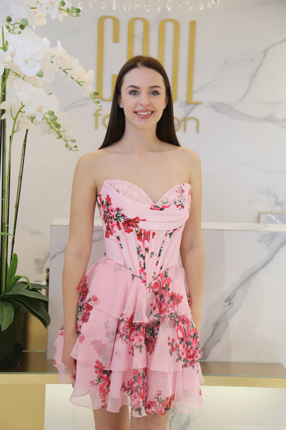 Az A vonalú szabás és a háromrétegű fodros szoknyarész könnyed mozgást, légies esést ad a ruhának, amely járás közben különösen látványos. A babarózsaszín alap és az élénk pink virágos minta friss, üde megjelenést kölcsönöz, így a ruha tökéletes választás nyári rendezvényekre, kerti partikra, esküvőre vendégként vagy akár romantikus vacsorára.