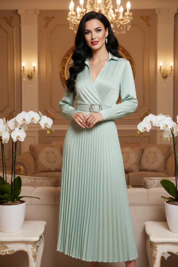 Elegáns és nőies midi ruha, amelyet az átlapolt mellrész és a pliszírozott szoknya tesz igazán különlegessé. A vékony öv a ruha tartozéka, de nem a képen látható változat.