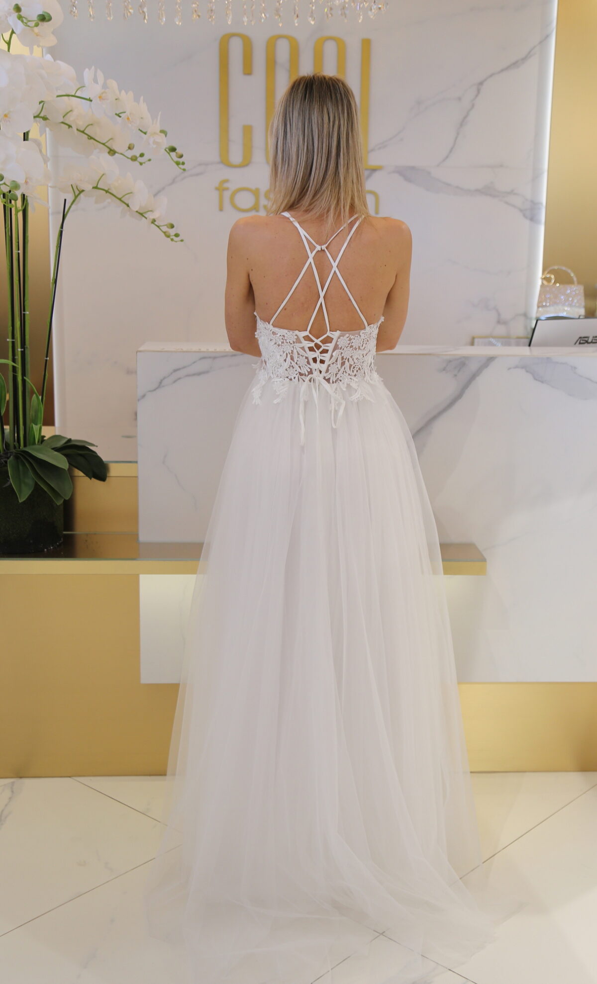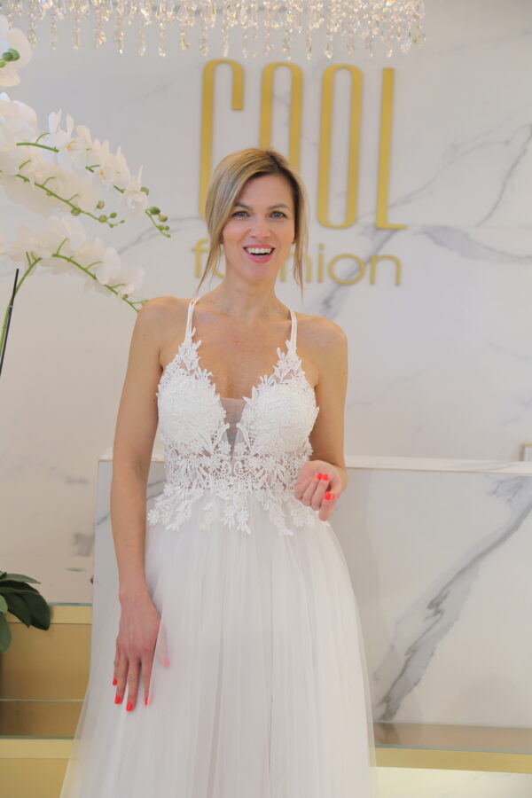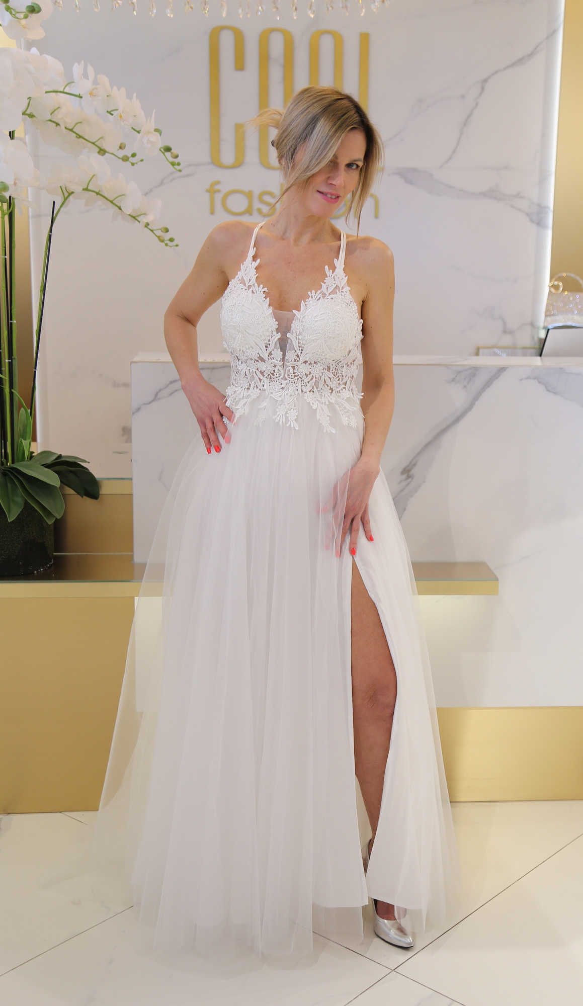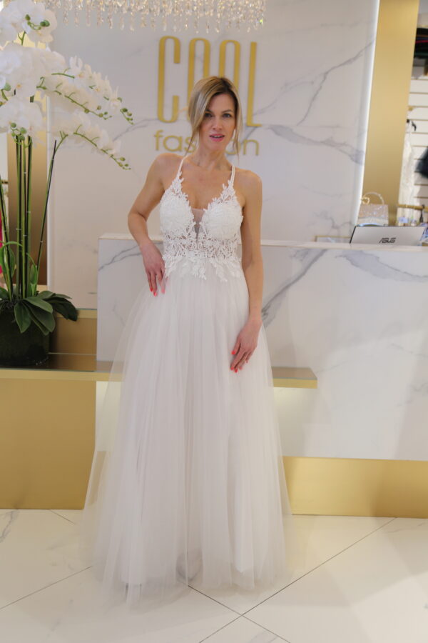 A felsőrészt díszítő 3D csipkék különleges, kézzel kidolgozott hatást keltenek, amelyek azonnal magukra vonják a tekintetet. A derékban szabott fazon karcsúsít, majd a tüllös szoknyarész könnyed, légies eséssel omlik alá, romantikus, mesebeli megjelenést kölcsönözve a ruhának.