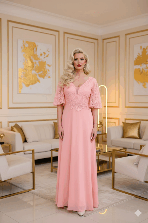 A Ruby barack színű molett maxi ruha nőies szabásával és finom csipkerészleteivel tökéletes választás különleges alkalmakra, esküvőre vagy ünnepi eseményekre. A V kivágott mellrész és a csipkés felsőrész, valamint az elegáns ujjmegoldás kiemeli a nőies vonalakat, míg a bő szabású maxi fazon kényelmes viseletet biztosít. Méretnélküli kialakítása miatt ideális választás akár 5XL méretig is.