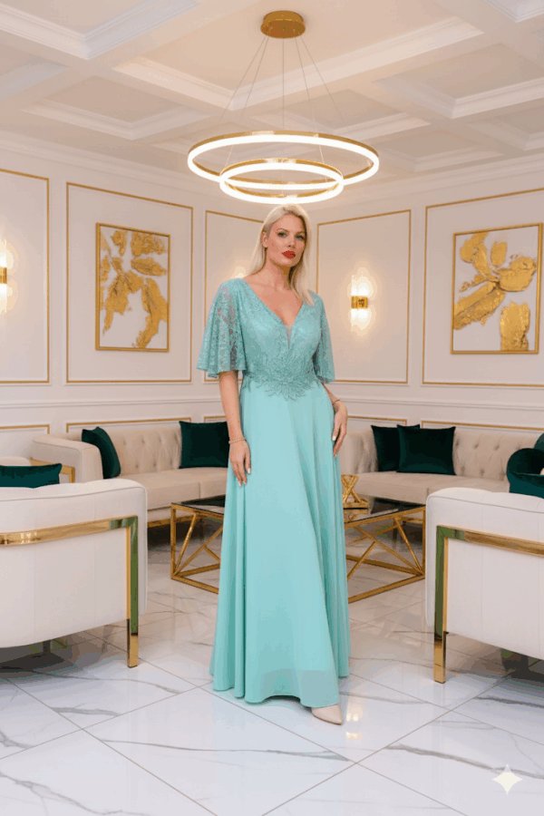 A Ruby mentazöld színű molett maxi ruha nőies szabásával és finom csipkerészleteivel tökéletes választás különleges alkalmakra, esküvőre vagy ünnepi eseményekre. A V kivágott mellrész és a csipkés felsőrész, valamint az elegáns ujjmegoldás kiemeli a nőies vonalakat, míg a bő szabású maxi fazon kényelmes viseletet biztosít. Méretnélküli kialakítása miatt ideális választás akár 5XL méretig is.