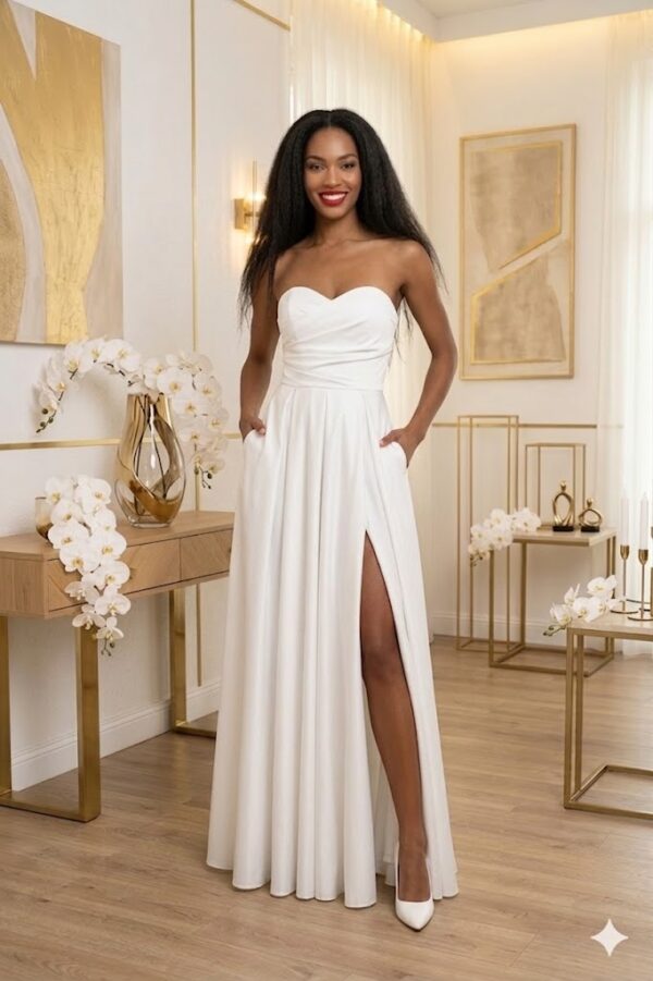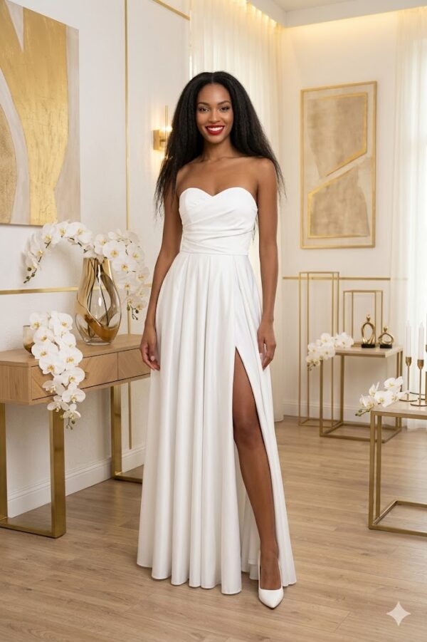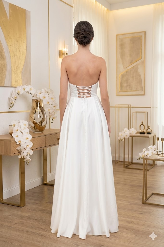Ha olyan ruhát keresel, ami egyetlen pillanat alatt vörös szőnyeg-hangulatot teremt, ez a pánt nélküli szatén maxi ruha telitalálat. A selymes fényű anyag finoman követi a vonalaidat, miközben a fűzős hát megadja azt a magabiztos tartást és tökéletes illeszkedést, amitől igazán „wow” lesz a megjelenésed.