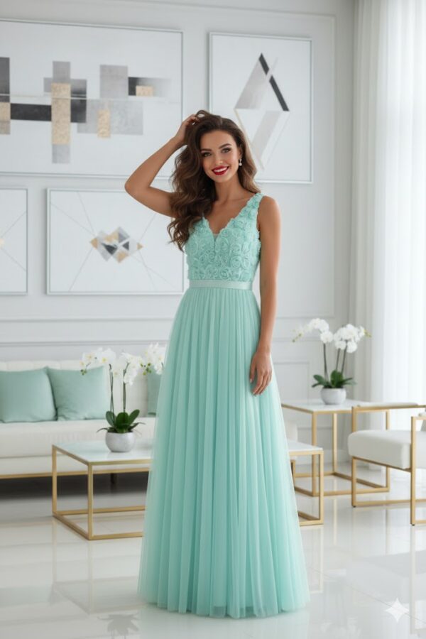 A Selindra mentazöld rózsás maxi ruha igazi romantikus darab, amely finom részleteivel és nőies szabásával azonnal elvarázsol. Az A vonalú, derékban szabott fazon előnyösen hangsúlyozza az alakot, miközben kényelmes viseletet biztosít. A rózsás felsőrész különleges, elegáns megjelenést ad, míg a tüllös szoknyarész könnyed, légies mozgást kölcsönöz a ruhának.