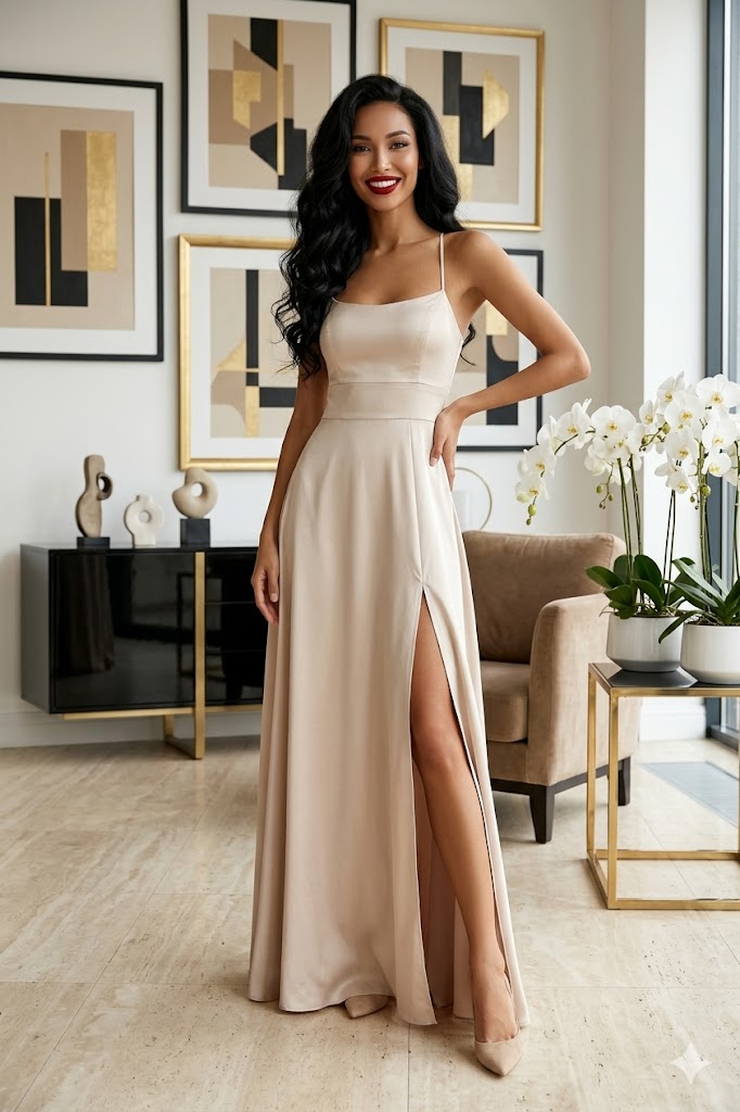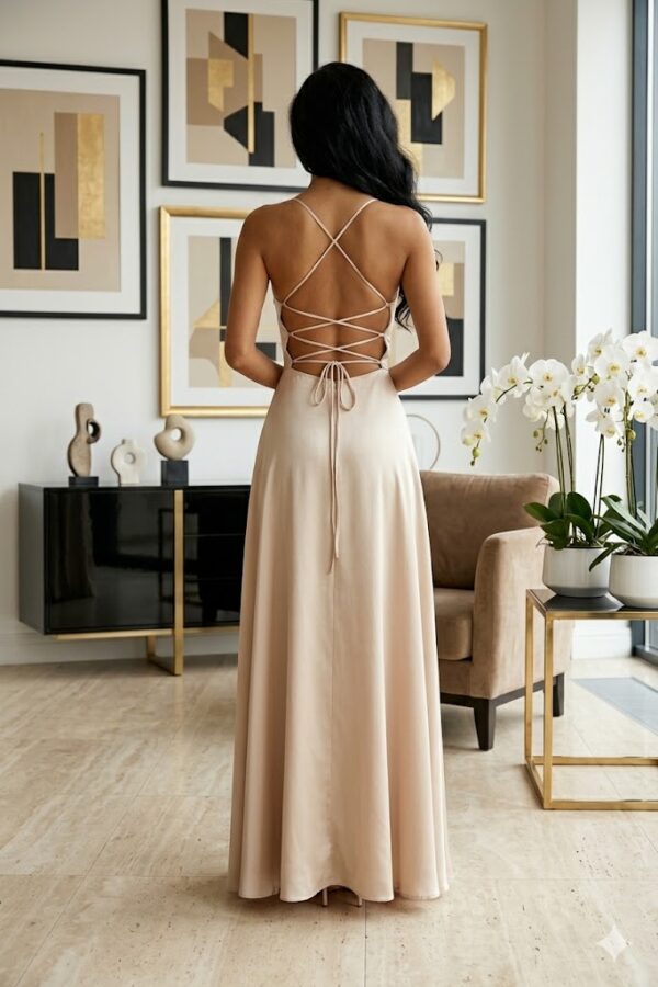A Sidney szatén maxi ruha tökéletes választás, ha stílusos és különleges megjelenésre vágysz. A fűzős hátmegoldás nemcsak dekoratív, hanem lehetővé teszi az egyedi illeszkedést is, míg a kámzsás nyakrész elegánsan kiemeli a dekoltázst.