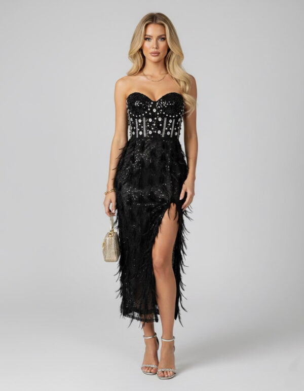 Látványos, elegáns midi ruha köves és tollas részletekkel, amely tökéletes választás különleges alkalmakra, amikor igazán ragyogni szeretnél.