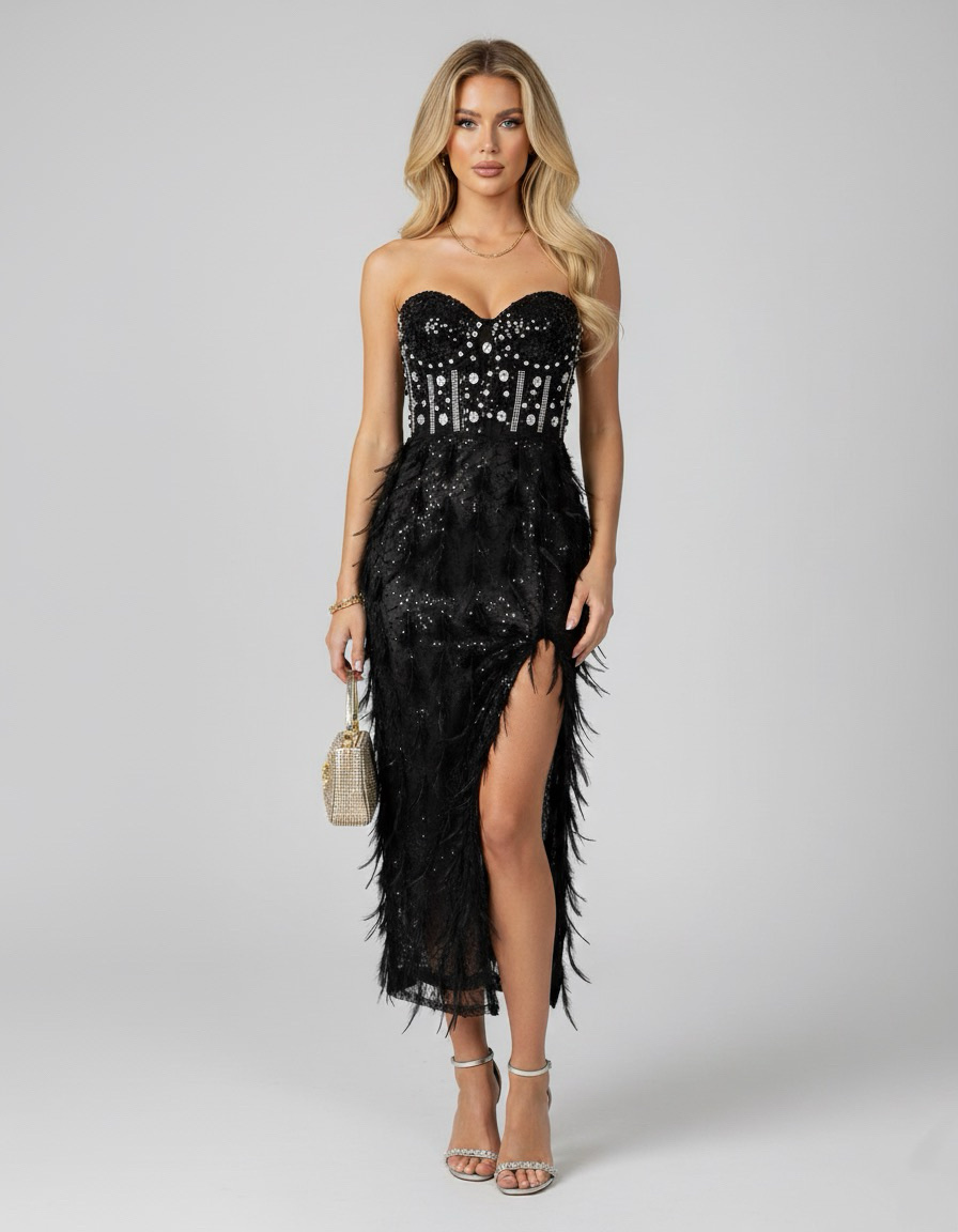 A Silvia tollas midi ruha igazi alkalmi különlegesség, amely a pánt nélküli szabás és a kövekkel díszített, necces-halszálkás felsőrész kombinációjával azonnal magára vonja a figyelmet. A szivacsos mellrész stabil tartást biztosít, miközben nőies vonalakat hangsúlyoz. A tollas szoknyarész és az elülső slicc elegáns mozgást ad a ruhának, így minden lépésnél különleges hatást kelt.