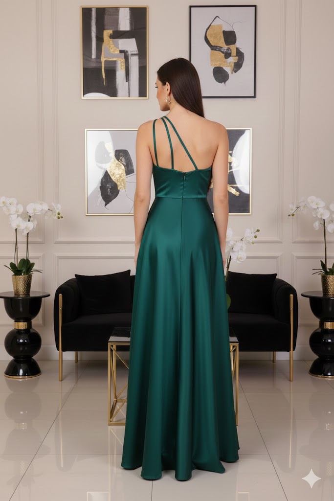 Ez a szatén félvállas maxi ruha tökéletes választás, ha igazán elegáns és nőies megjelenésre vágysz. A finoman fénylő szatén anyag luxus érzetet kelt, miközben a maxi hossz kifinomult, alkalmi stílust sugároz. A félvállas megoldás és a spagetti pánt modern, divatos összhatást ad, amely kiemeli a vállakat és a dekoltázst.