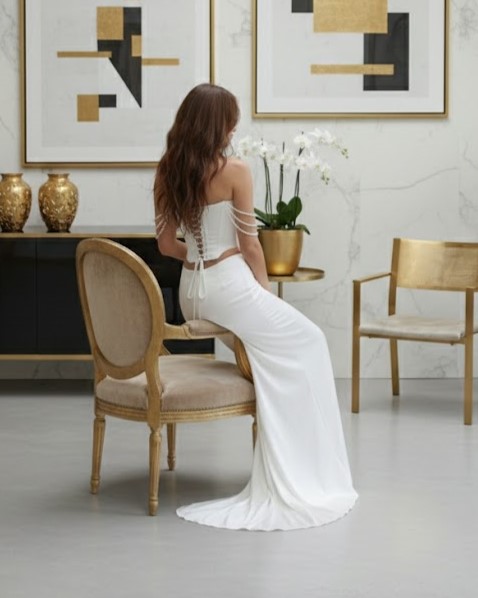A felsőt finoman ejtett gyöngysorok díszítik, amelyek lágyan keretezik a vállat és a kart, exkluzív, romantikus megjelenést kölcsönözve a szettnek. A szatén szoknya sellő fazonú, testhez simuló vonalvezetéssel indul, majd uszályos kialakításban teljesedik ki, amely mozgás közben is lenyűgöző hatást kelt. A hasrésznél elhelyezett húzás tovább fokozza az alakformáló hatást.