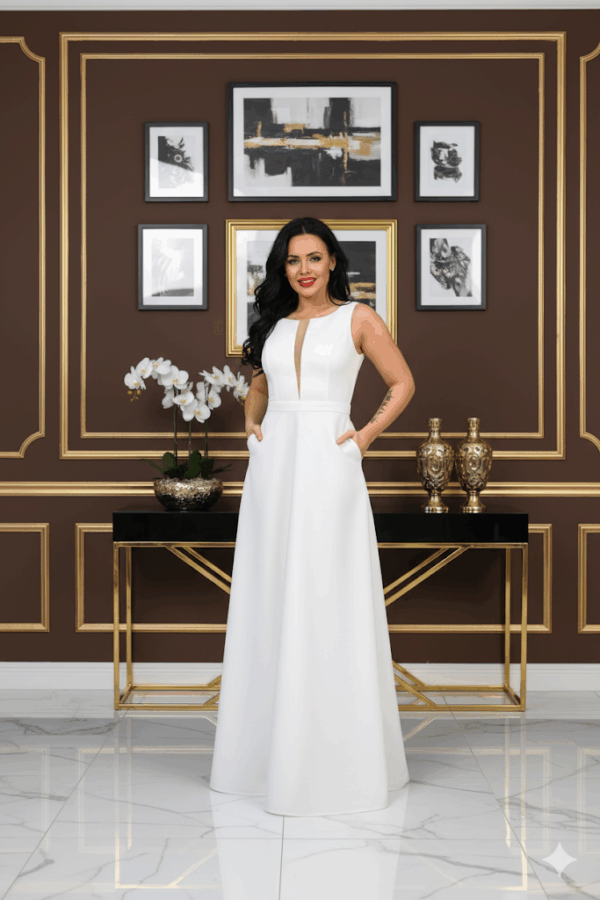 Kifinomult és elegáns Stella maxi ruha, amely tökéletes választás különleges alkalmakra. A dekoltázsnál található neccbetét modern és sejtelmes hatást kölcsönöz, míg a szatén anyag exkluzív megjelenést biztosít. Az enyhén push up-os kialakítás gyönyörű tartást ad a mellrésznél, míg a cipzáras hátmegoldás megkönnyíti a viselést.