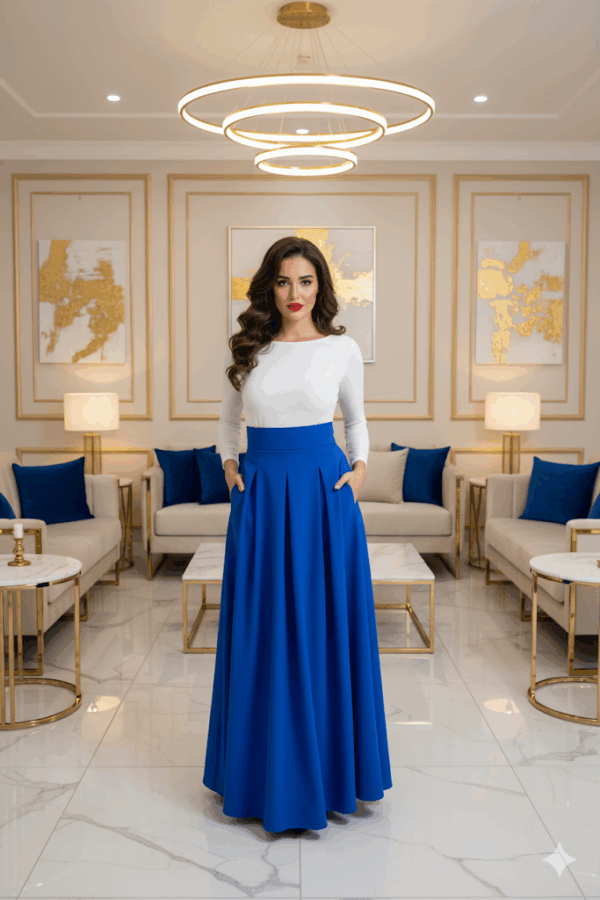 A zsebes maxi szoknya ideális választás a mindennapi eleganciához és a különleges alkalmakhoz is. A rakott fazon és a magas derekú szabás kiemeli az alakot, miközben kényelmes viseletet biztosít. Az elülső zsebek praktikusak, és stílusos kiegészítők az egyébként letisztult, klasszikus megjelenéshez.