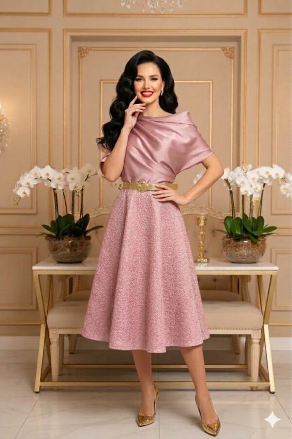 A kámzsás nyakrész lágyan omlik, nőies keretet adva a felsőtestnek, a rövid ujjú szabás pedig kényelmes viseletet biztosít. Ideális választás alkalmi eseményekre, családi ünnepekre, elegáns nappali programokra vagy akár esküvői vendégként is. A Valmira ruha magassarkúval és letisztult kiegészítőkkel viselve igazán kifinomult megjelenést nyújt.