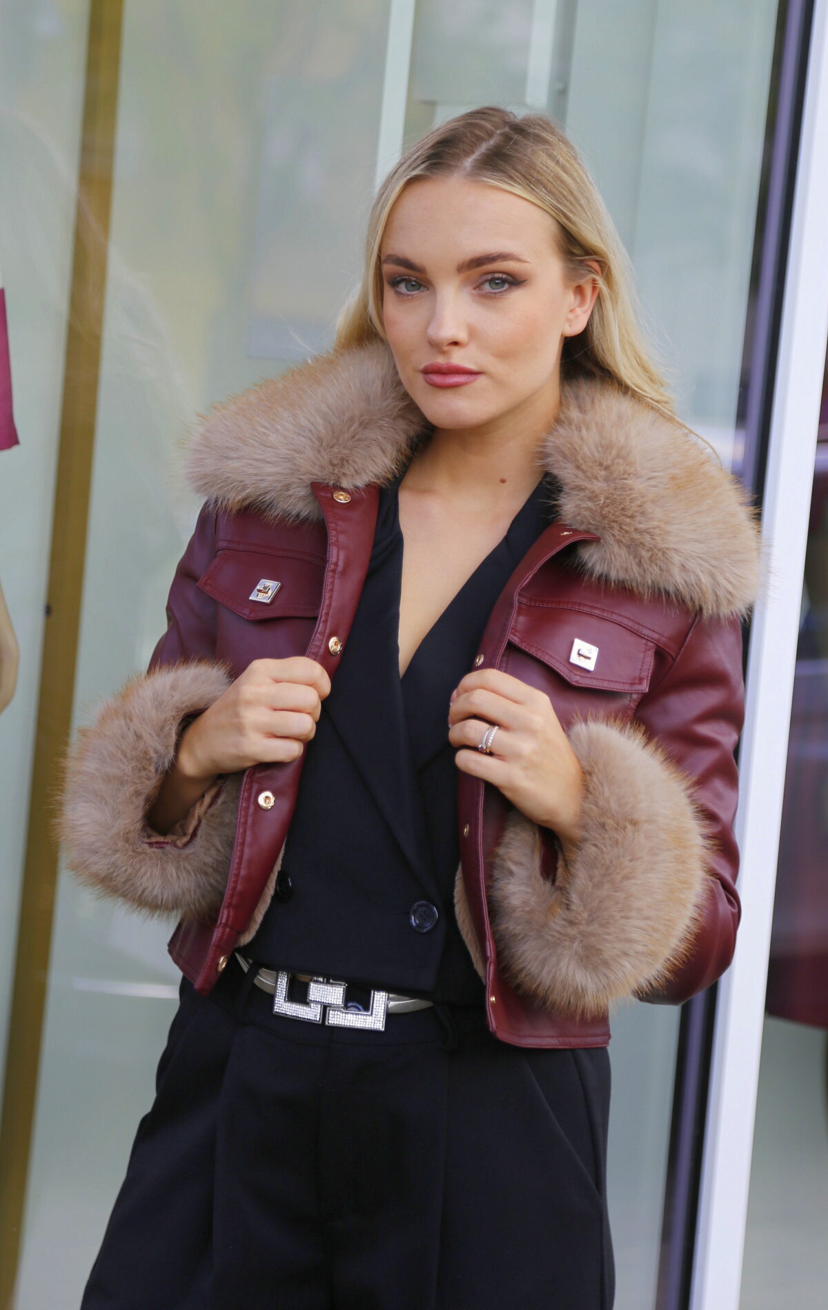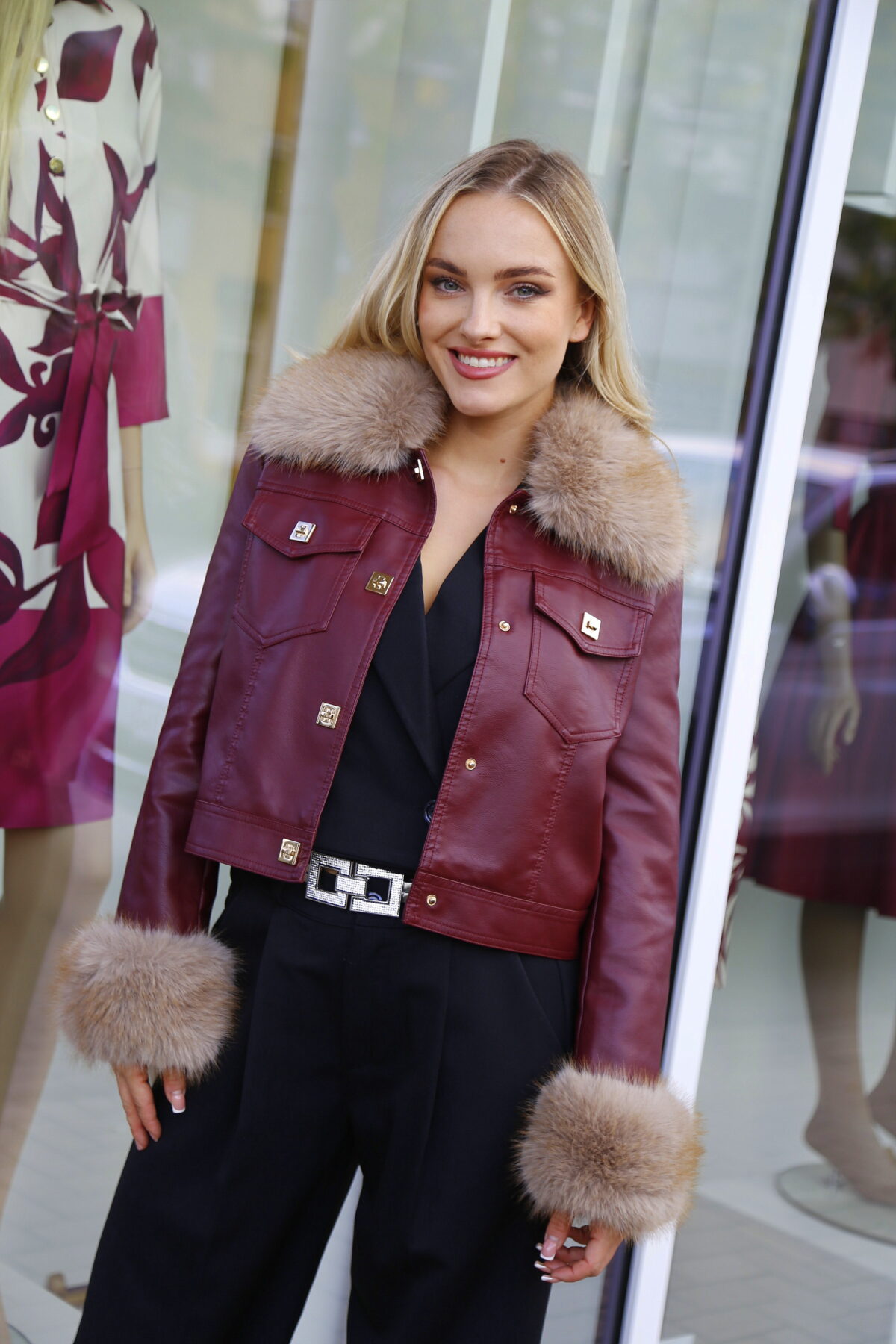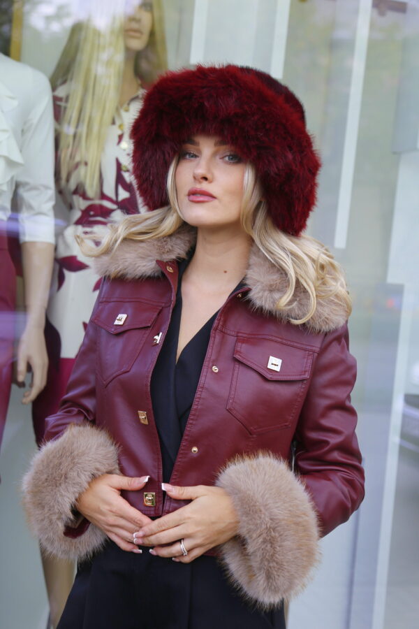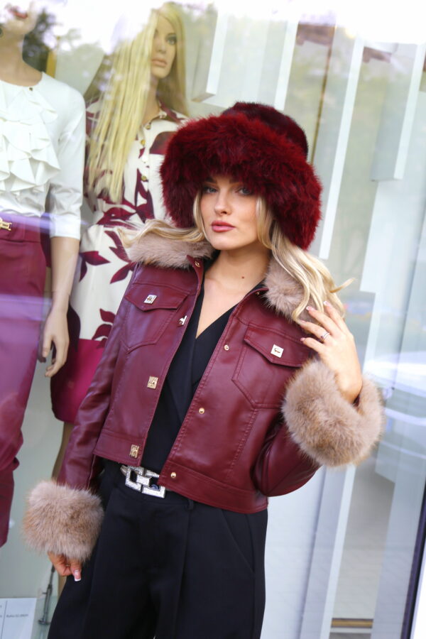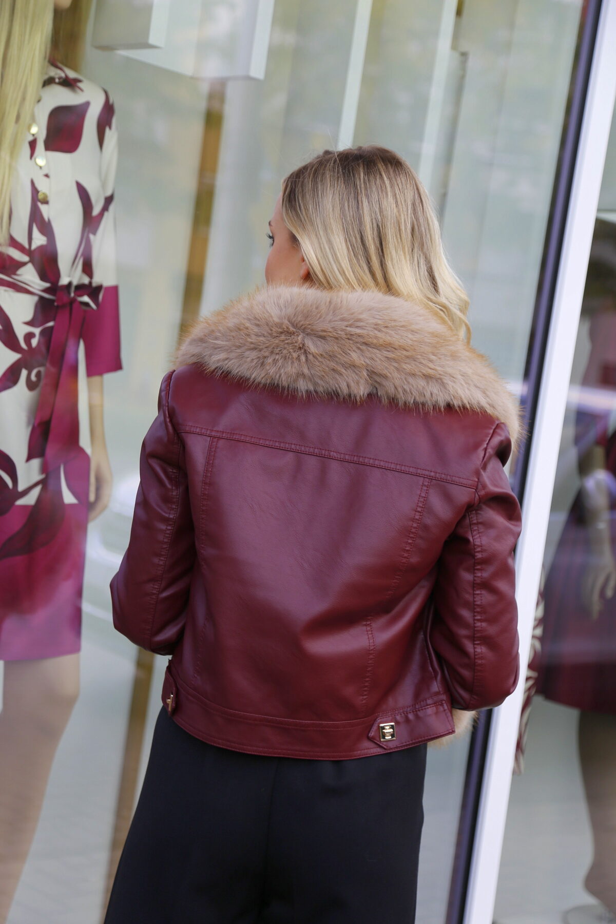 A Vanda bordó szőrmés bőr kabát stílusos és praktikus választás az őszi-téli szezonra. Műbőr anyaga, levehető szőrméi és arany pattentos záródása modern, elegáns megjelenést biztosít, miközben a bunda bélés kényelmes, meleg viseletet nyújt.