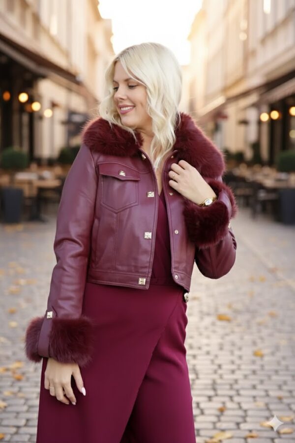 A Vanda burgundi szőrmés bőr kabát stílusos és praktikus választás az őszi-téli szezonra. Műbőr anyaga, levehető szőrméi és arany pattentos záródása modern, elegáns megjelenést biztosít, miközben a bunda bélés kényelmes, meleg viseletet nyújt.