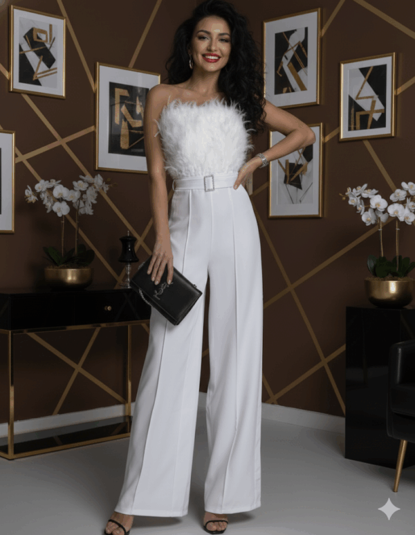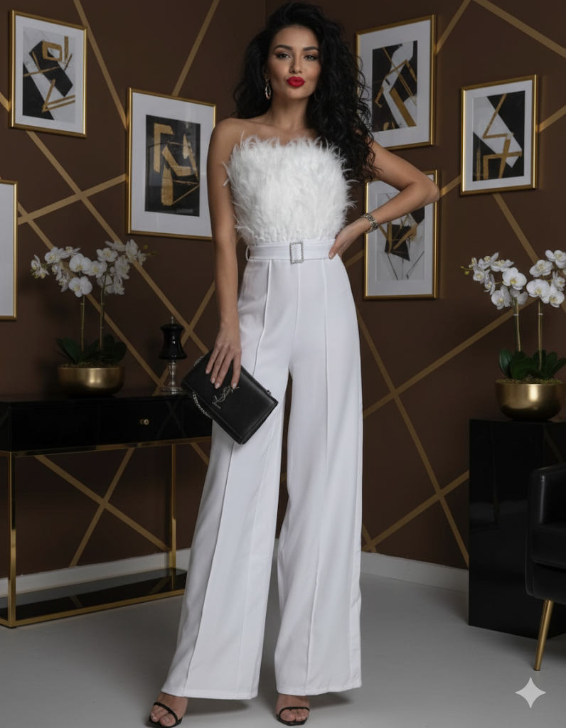 Az extrém, mégis elegáns szabásvonal kiemeli a nőies vonalakat, miközben a bő nadrágszárak légies és drámai hatást keltenek. A pánt nélküli kialakítás modern és letisztult megjelenést ad, amely kiválóan mutat egy elegáns nyaklánccal vagy statement ékszerekkel.