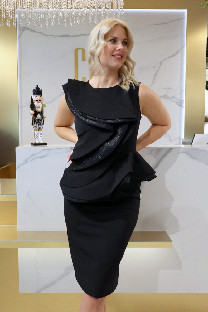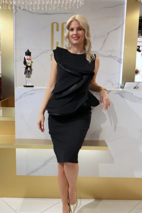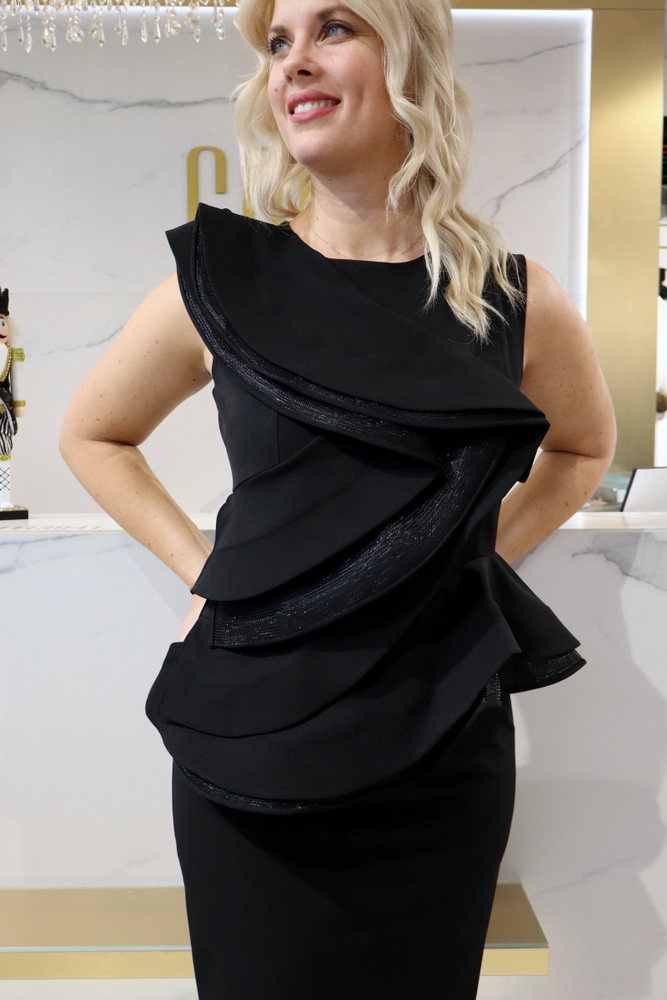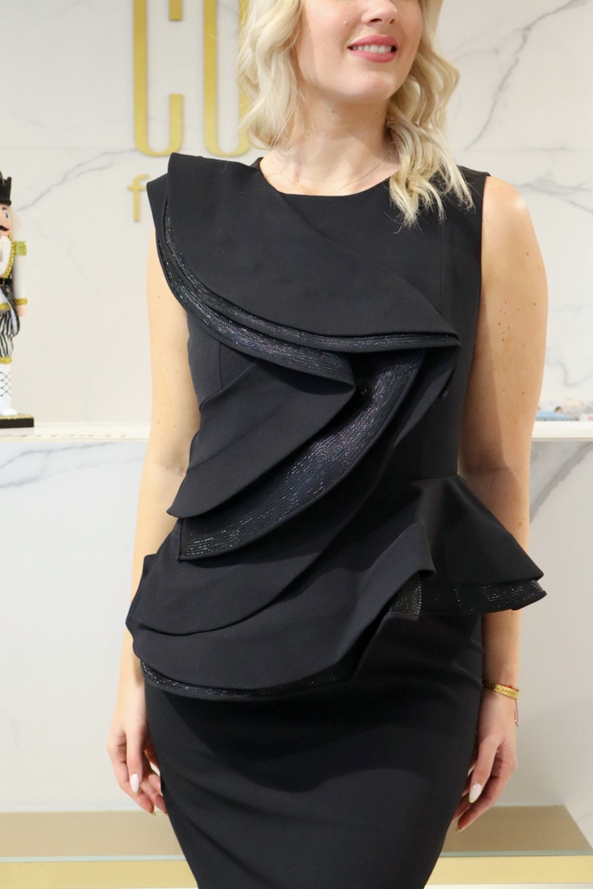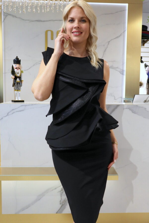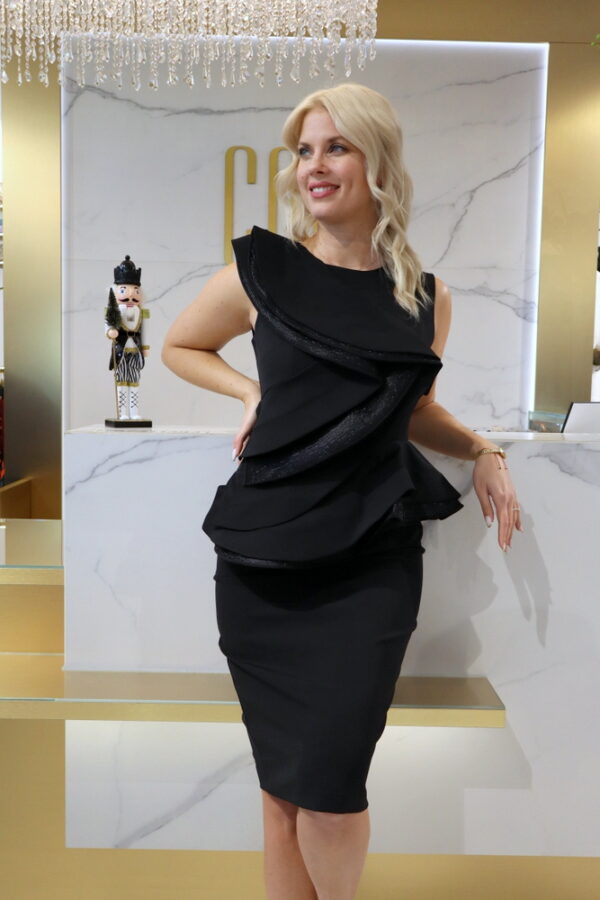 A Vivat fekete fodros ruha igazi statement darab, amely a minimalista szabást látványos részletekkel ötvözi. A mellrészen és a deréknál elhelyezett nagy fodrok különleges karaktert adnak a ruhának, miközben szépen formálják az alakot és kiemelik a nőies vonalakat.