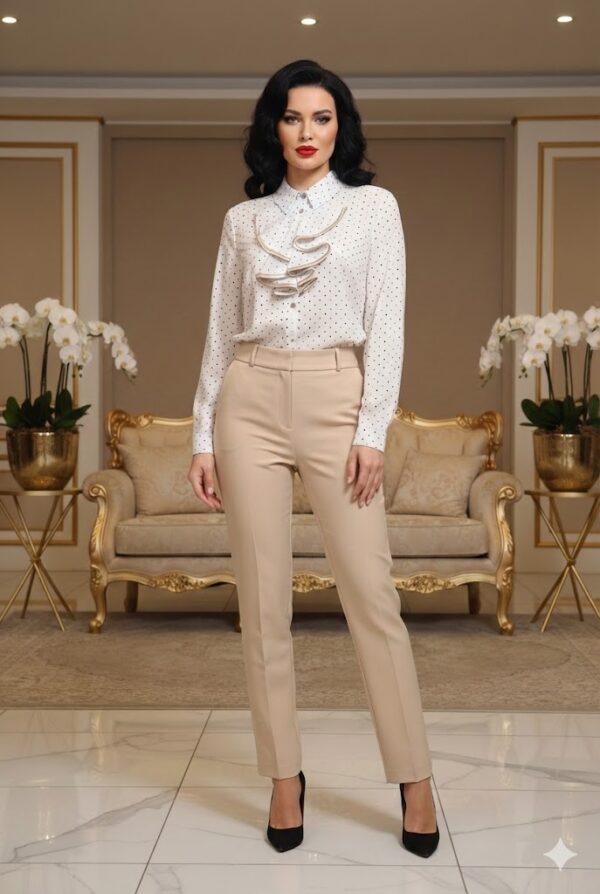 A Yvett zsabós blúz egy igazi klasszikus, amely minden nő gardróbjában megállja a helyét. Az ing fazonú szabás és a végig gombos záródás letisztult, nőies megjelenést biztosít, míg a zsabós díszítés romantikus, különleges karaktert kölcsönöz a blúznak.