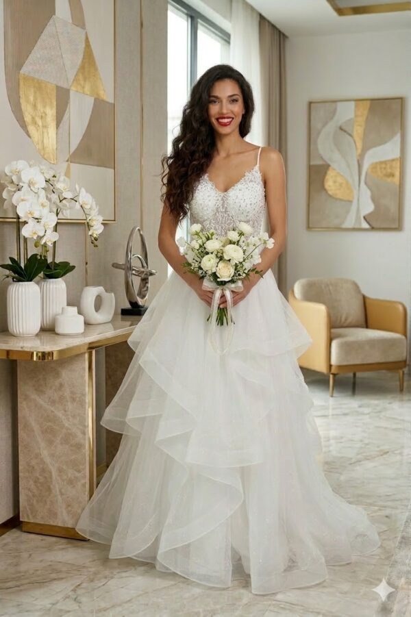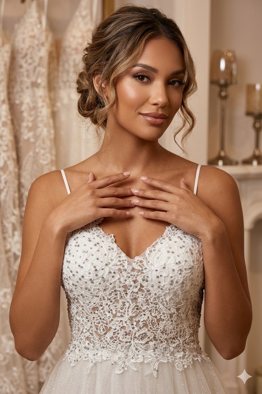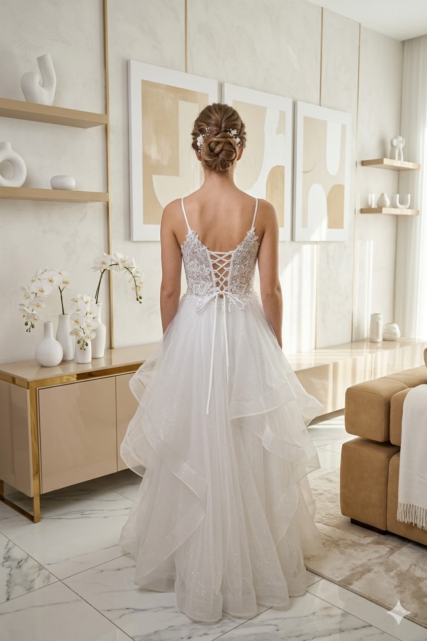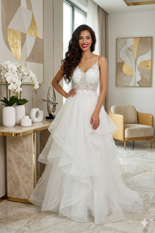 Van az a ruha, amit elég egyszer felvenni, és máris megváltozik a tartásod: magabiztosabb leszel, nőiesebb, és minden mozdulatod egy kicsit ünnepibb. Ez a spagetti pántos darab pontosan ilyen – a csipkés, köves felsőrész kifinomult ragyogást ad, a hullám tüll szoknya pedig könnyed, mesés volumenével gondoskodik róla, hogy belépésed emlékezetes legyen.